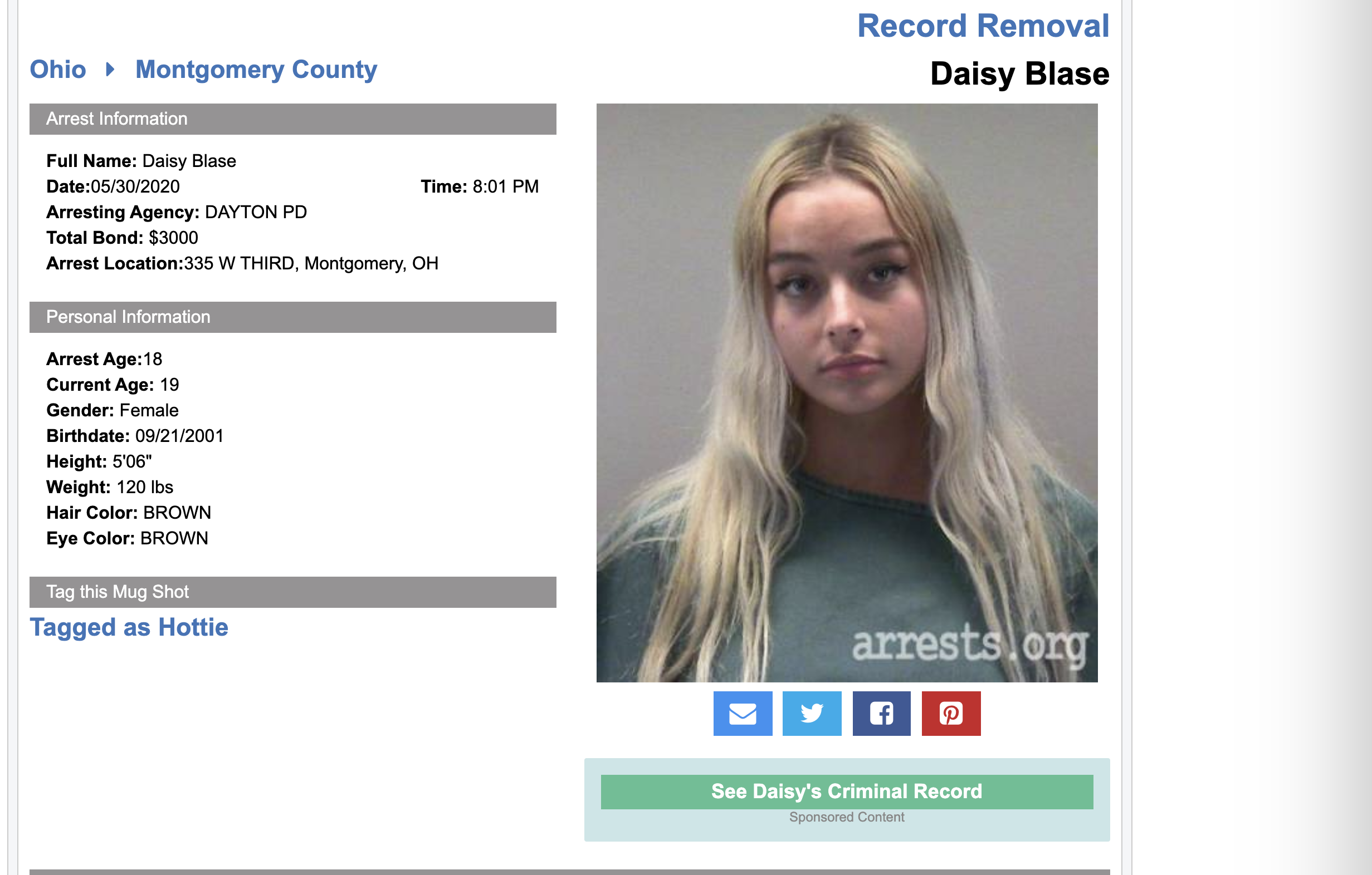 Arrested for disorderly conduct and rioting at Dayton, OH protest following the death of George Floyd https://ohio.arrests.org/Arrests/Daisy_Blase_45202399/ https://twitter.com/daisyblase/status/1267500510732595201