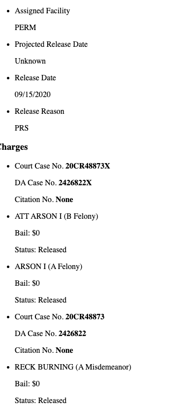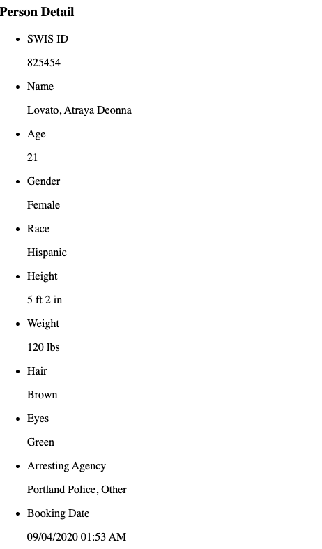 https://twitter.com/AntifaWatch2/status/1301892951044390917 https://webcache.googleusercontent.com/search?q=cache:https://www.mcso.us/PAID/Home/Booking/1507748&strip=1&vwsrc=0 Social Media "Influencer" Atraya Lovato, pictured in an article about #Portland #BLM riots is under arrest for Arson, bail set at 250k Not clear if this is riot related or not, social media indicates it probably is. Shows she participated in riots - 'Fuck 12 fire on these hoes'