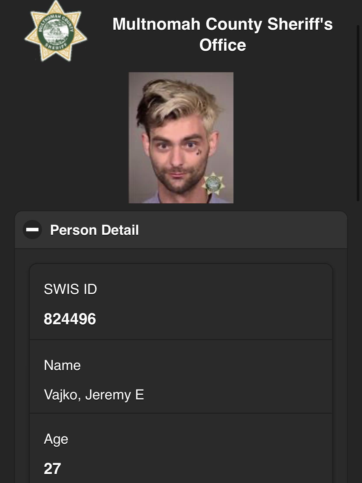 https://www.portlandoregon.gov/police/news/read.cfm?id=250907 http://www.mcso.us/PAID/Home/Booking/1505211 * Jeremy Vajko, 27 years-old, Interfering with Police Officer