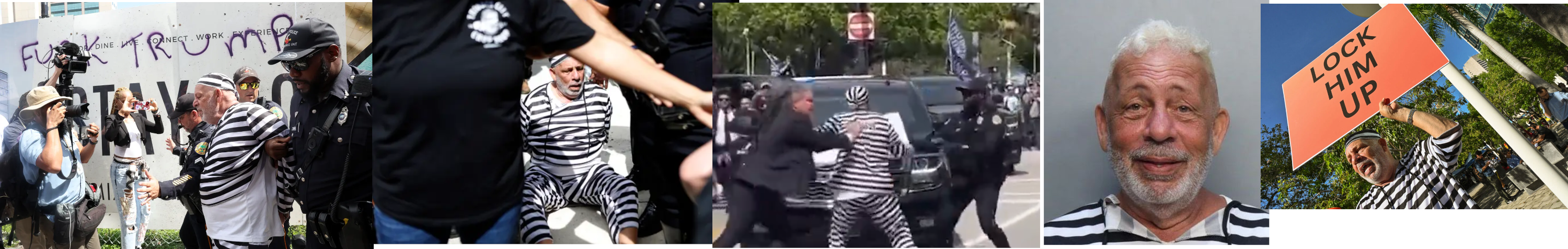 Dominic F. Santana (born Jun. '62) was arrested at Trump's arraignment hearing in June 2023 in Miami. He ran in front of Trump's motorcade and was manhandled by police and Secret Service officers. Santana said in an interview he came out to see Trump locked up "once and for all". He foreshadowed his arrest by wearing an old-fashioned jailbird uniform. Miami Antifa had called for violence against MAGA supporters, including the use of vehicles to run over Trump's fan club although the Antifa types were greatly outnumbered by Trump supporters. Santana is from New Jersey and moved to Miami on his retirement. He lives in a modest condo in the Little Havana neighborhood of Miami. https://archive.ph/q5gUw https://archive.ph/1B0EY
