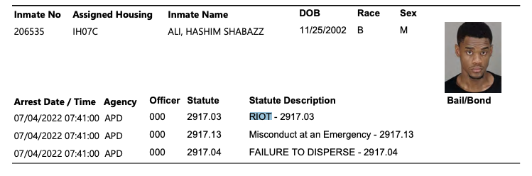 Arrested during Akron BLM riots. Arrest Date / Time Agency Officer Statute Statute Description Bail/Bond 07/04/2022 07:41:00 APD 000 2917.03 RIOT - 2917.03 07/04/2022 07:41:00 APD 000 2917.13 Misconduct at an Emergency - 2917.13 07/04/2022 07:41:00 APD 000 2917.04 FAILURE TO DISPERSE - 2917.04