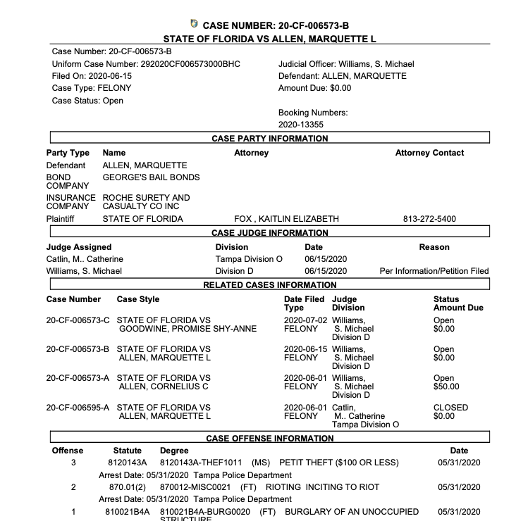 (MS) PETIT THEFT ($100 OR LESS) 05/31/2020 (F)RIOTING INCITING TO RIOT 05/31/2020 (F)BURGLARY OF AN UNOCCUPIED STRUCTURE