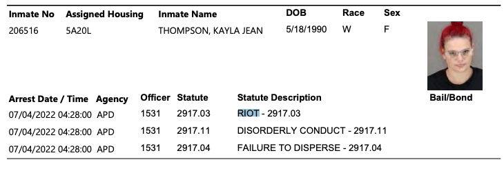 Arrested during Akron BLM riots. Arrest Date / Time Agency Officer Statute Statute Description Bail/Bond 07/04/2022 04:28:00 APD 1531 2917.03 RIOT - 2917.03 07/04/2022 04:28:00 APD 1531 2917.11 DISORDERLY CONDUCT - 2917.11 07/04/2022 04:28:00 APD 1531 2917.04 FAILURE TO DISPERSE - 2917.04