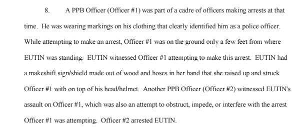 http://www.mcso.us/PAID/Home/Booking/1505990 https://www.portlandoregon.gov/police/news/read.cfm?id=250994 ASSAULT POLICE OFF (C Felony) https://www.justice.gov/usao-or/pr/three-portlanders-charged-civil-disorder-after-assaulting-local-police-officers https://www.courtlistener.com/docket/18425661/united-states-v-eutin/