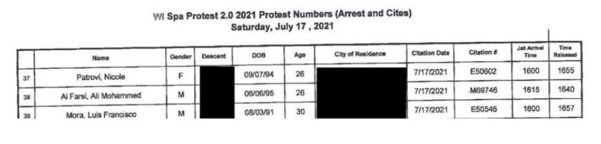 Arrested during echo park protest in LA in march 2021. 169 recorded arrests Data obtained via records request, emailed admin account with full details