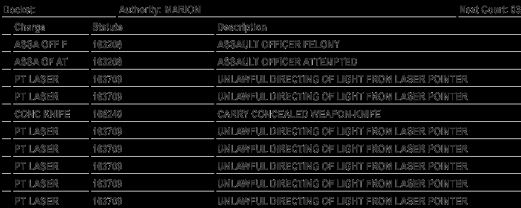 https://archive.ph/wip/FSJXN Anthony Villaneda, age 18: Unlawful pointing of a laser, five counts Salem Antifa riot The jail booking also lists felony assault of an officer and carrying a concealed knife, those charges are not listed in the press release however
