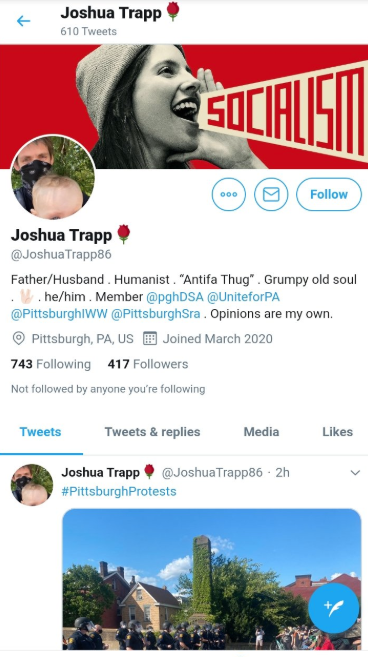 Self-admitted "Antifa Thug" according to his Twitter account. He has been at all of the recent protests in Pittsburgh References a Socialist Rifle Association within his Twitter Arrested at "Protest" for blocking and intersection and refusing to leave
