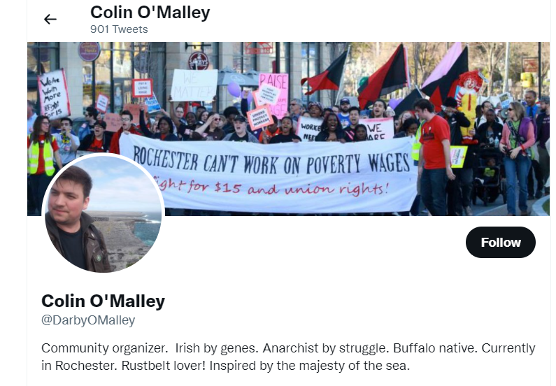Colin O'Malley is an anarcho-communist leader from the Rochester and formerly Buffalo NY area. He was the leader of Metro Justice (a communist front group that does protests in upstate NY). He is one of the leaders of Antifa in the area and most of his Metro Justice group was involved in it as well. He was accused of rape by multiple ex-partners and admitted he did it and apologized. He's a self-admitted anarchist and communist, yet regularly gets fawned over uncritically by the local media as a local protest organizer and activist while ignoring his obvious anarchist and communist beliefs. After the rape accusation, he quit Metro Justice and began working at the Rochester-Genessee Area Labor Federation. https://4sao.wordpress.com/tag/colin-omalley/ https://www.metrojustice.org/rally_for_jalil_muntaqim https://www.rochestercitynewspaper.com/rochester/metro-justices-reckoning-point/Content?oid=9144146 https://libcom.org/forums/theory/building-revolutionary-anarchism-article-07052016 https://www.gofundme.com/f/rocbrrn