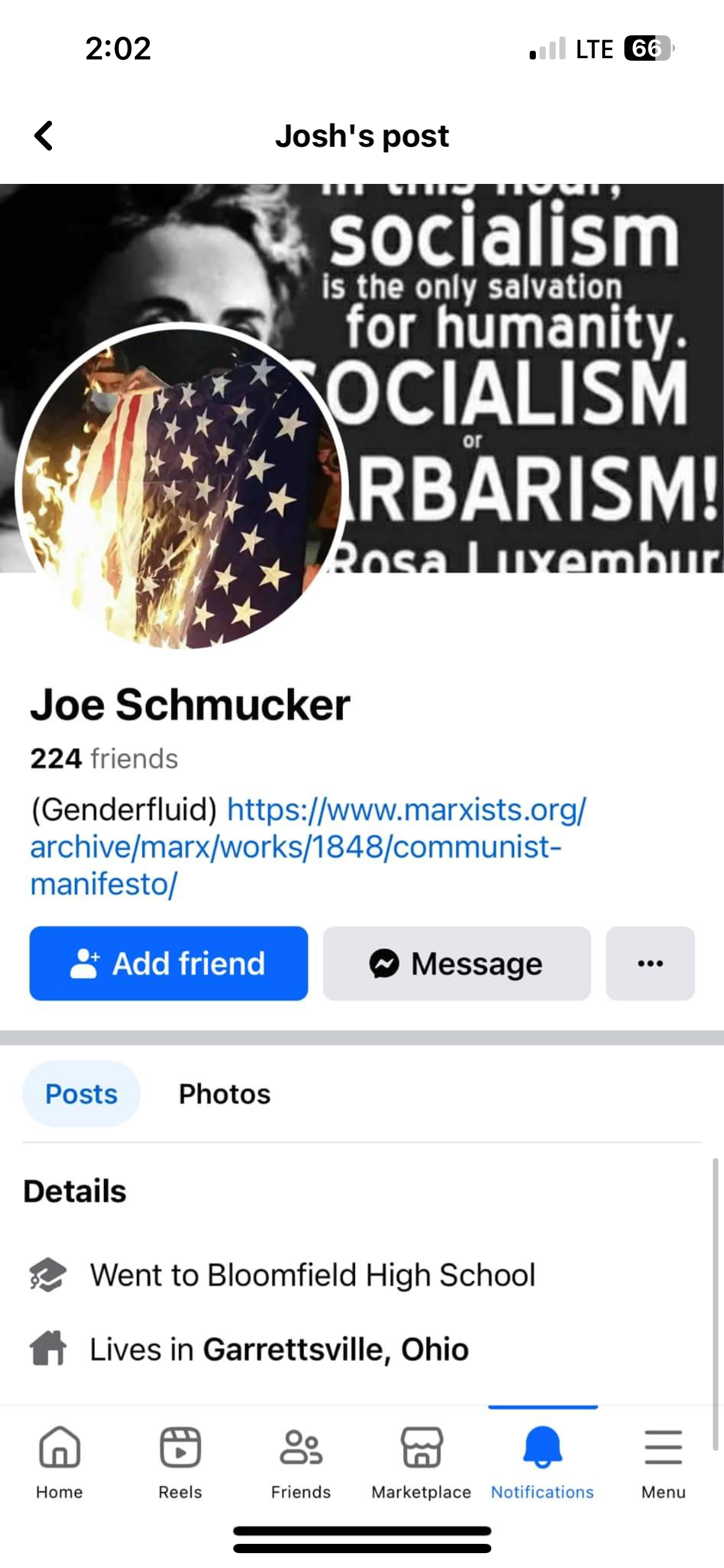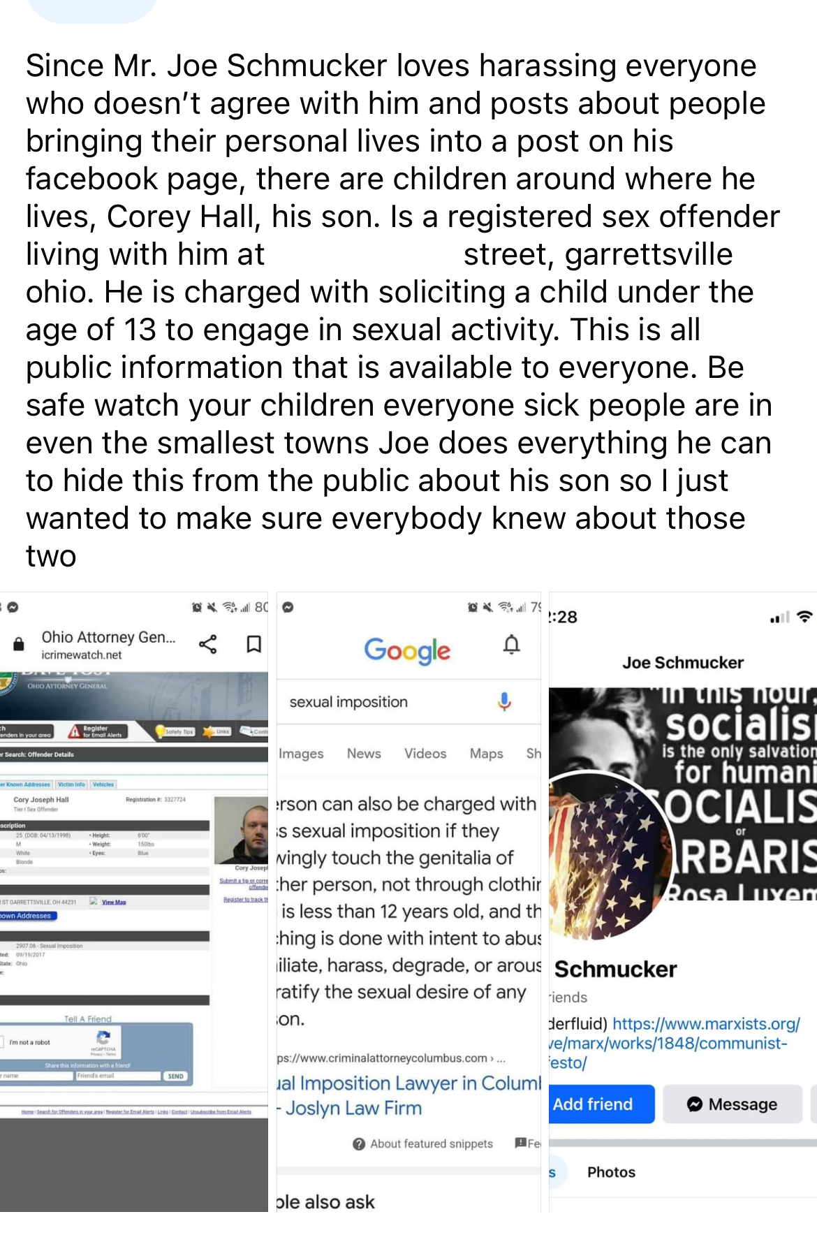 Left wing extremist from Northeast Ohio. Facebook likes indicate he may be part of Serve the people akron a mutual aid/riot support organization. He has a tier 1 sex offender son living at his house that he tries to hide, son's name is Cory Joseph Hall
