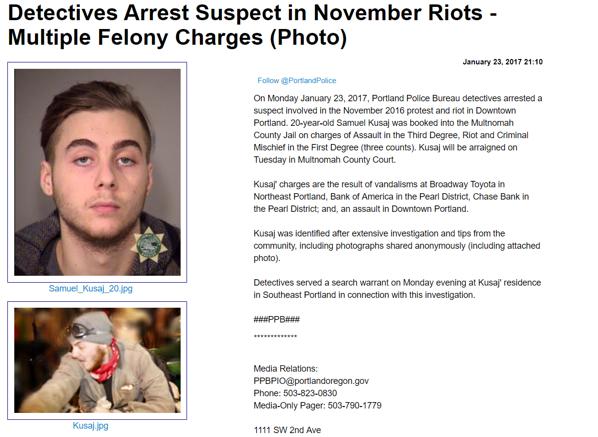 https://twitter.com/MrAndyNgo/status/1198793278428049408 Samuel John Wick Kusaj III, 20, wore a mask as he smashed windows & cars in Nov. 2016 in Portland. He also punched people & threatened them with rocks. He was sentenced to only 30 days in jail. In court, he said he was driven by a fear of Trump being elected. #AntifaMugshots