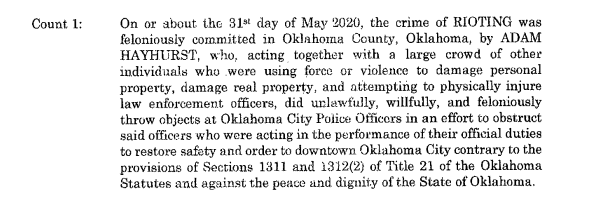 https://www.documentcloud.org/documents/6988651-Ruffin-Ortiz-Davis-Hayhurst-Dixon-Ok-State-Court.html https://oklahoman.com/article/5665507/protesters-charged-with-terrorism-rioting-assault Charged with rioting for May 31st events Also involved in an armed robbery last year http://www.news9.com/story/5e347d9d527dcf49dad74a9f/citizens-assist-okc-police-in-locating-3-teens-wanted-for-armed-robbery
