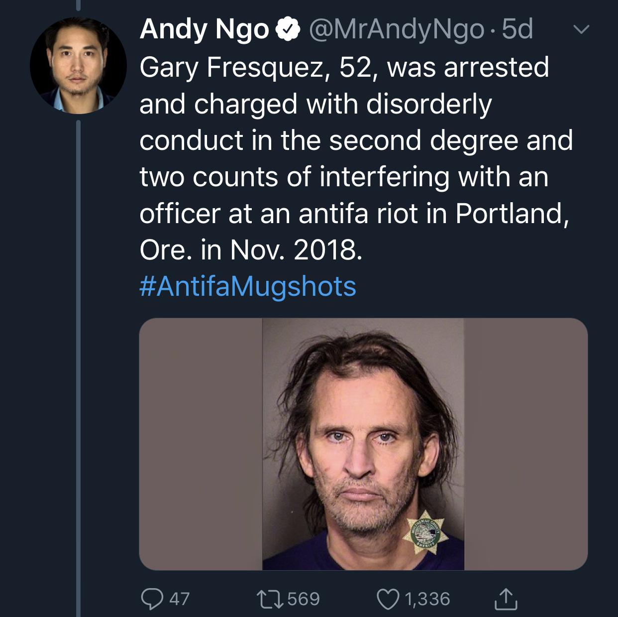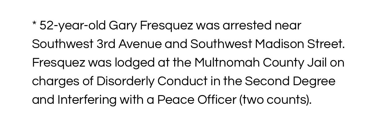 https://pamplinmedia.com/pt/9-news/412493-313328-6-arrested-released-during-saturday-protest-in-portland • Gary Fresquez, 52, was arrested near Southwest 3rd Avenue and Madison Street on charges of second-degree disorderly conduct and two counts of interfering with police.