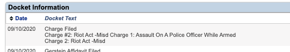 https://www.justice.gov/usao-dc/pr/woman-charged-throwing-lit-device-metropolitan-police-officer https://dcist.com/story/20/09/12/dc-protester-charged-assault-police/ Alanna Rogers, 26, of Baltimore, MD, was arraigned yesterday in the Superior Court of the District of Columbia on a criminal complaint charging her with felony assault on a police officer while armed and misdemeanor rioting based on her throwing a firework at police officers