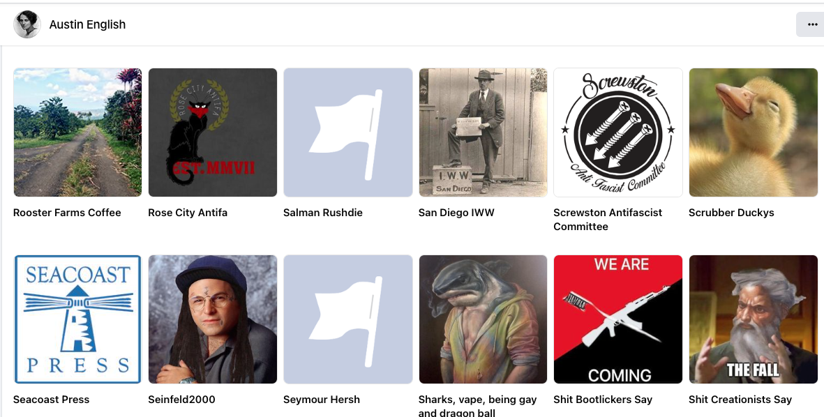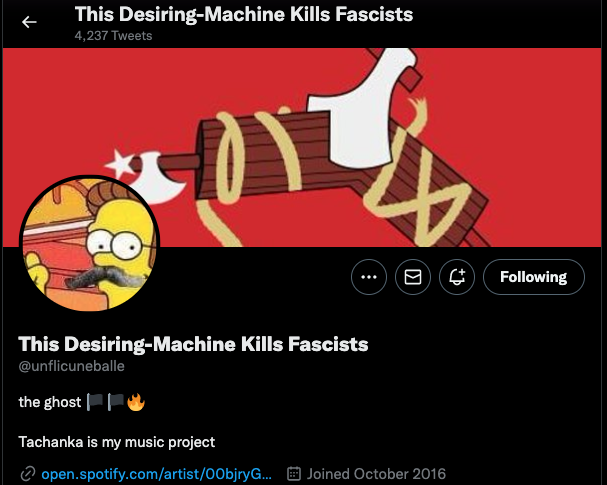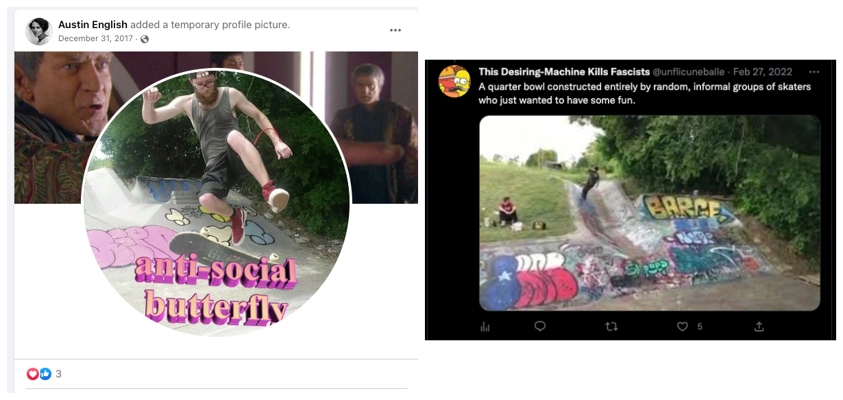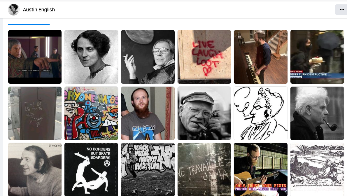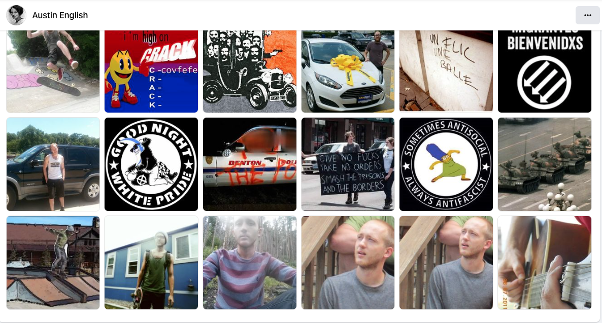 Austin English runs a twitter antifa/anarchist meme page titled "This Desiring-Machine Kills Fascists" (@unflicuneballe). "Un flic une balle" translates to one cop one bullet. I messaged additional info to admins for clarity, not sure if I can post He lives around Houston texas according to facebook, however he may have moved (https://twitter.com/unflicuneballe/status/1498100121699065862)
