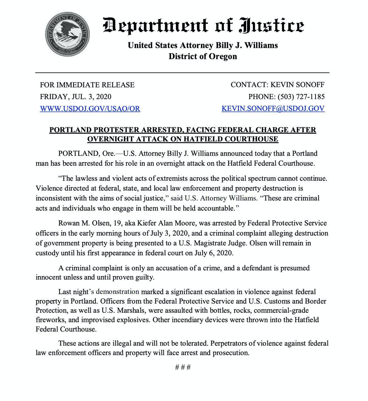 https://twitter.com/MrAndyNgo/status/1279278863504125955 https://www.mcso.us/PAID/Home/Booking/1505554 Rowan M. Olsen, 19, was arrested by federal police at the antifa riot attack on the courthouse. He gave authorities a fake name ("Kiefer Alan Moore") & fake age. He is currently on probation for convictions related to when he attacked an officer last year. http://archive.vn/goHjk https://www.courtlistener.com/docket/17328447/united-states-v-olsen/