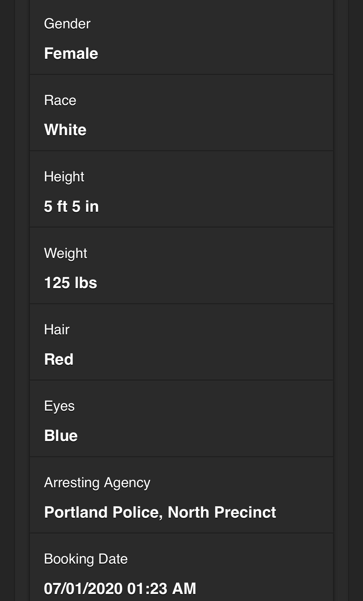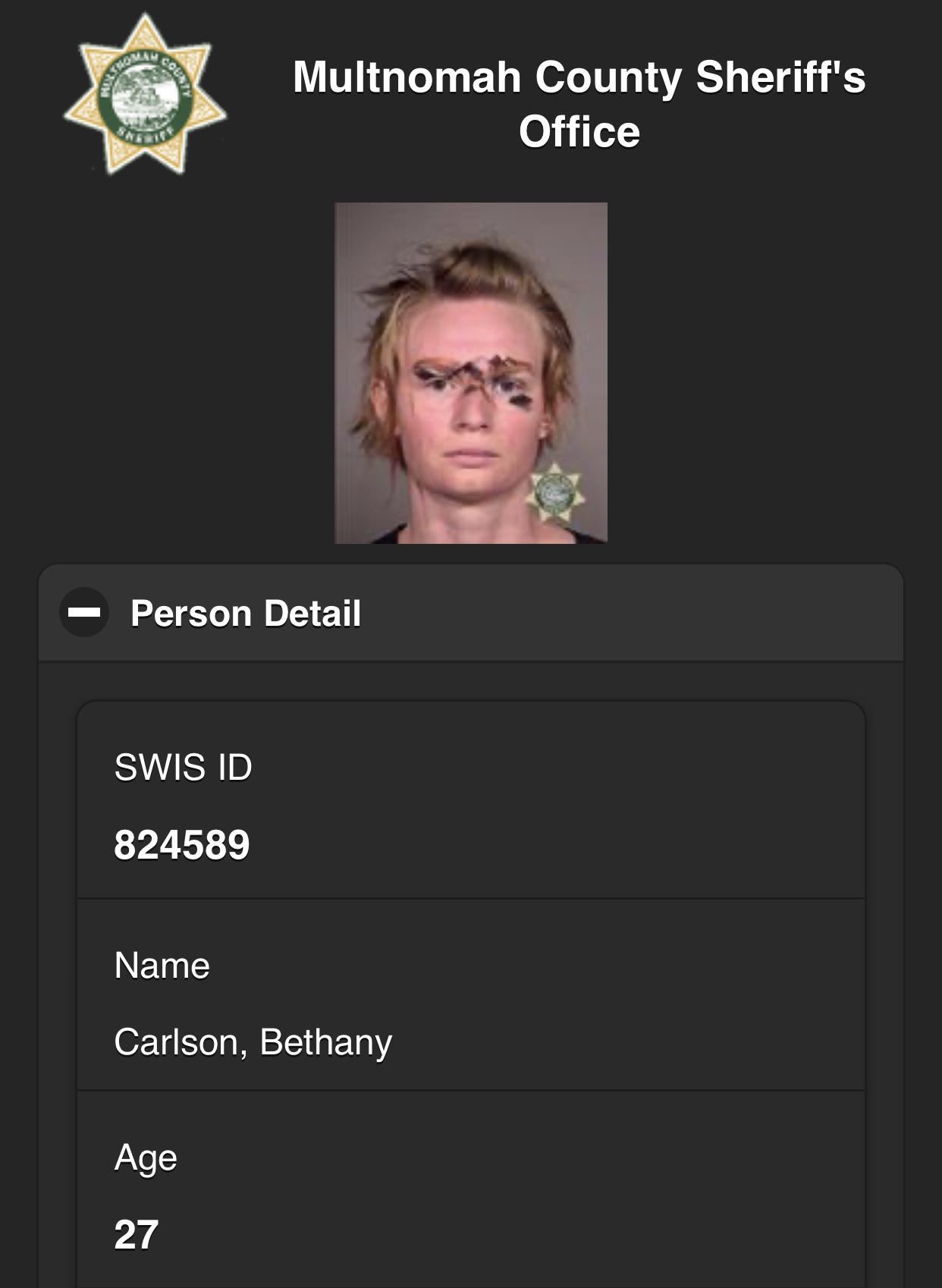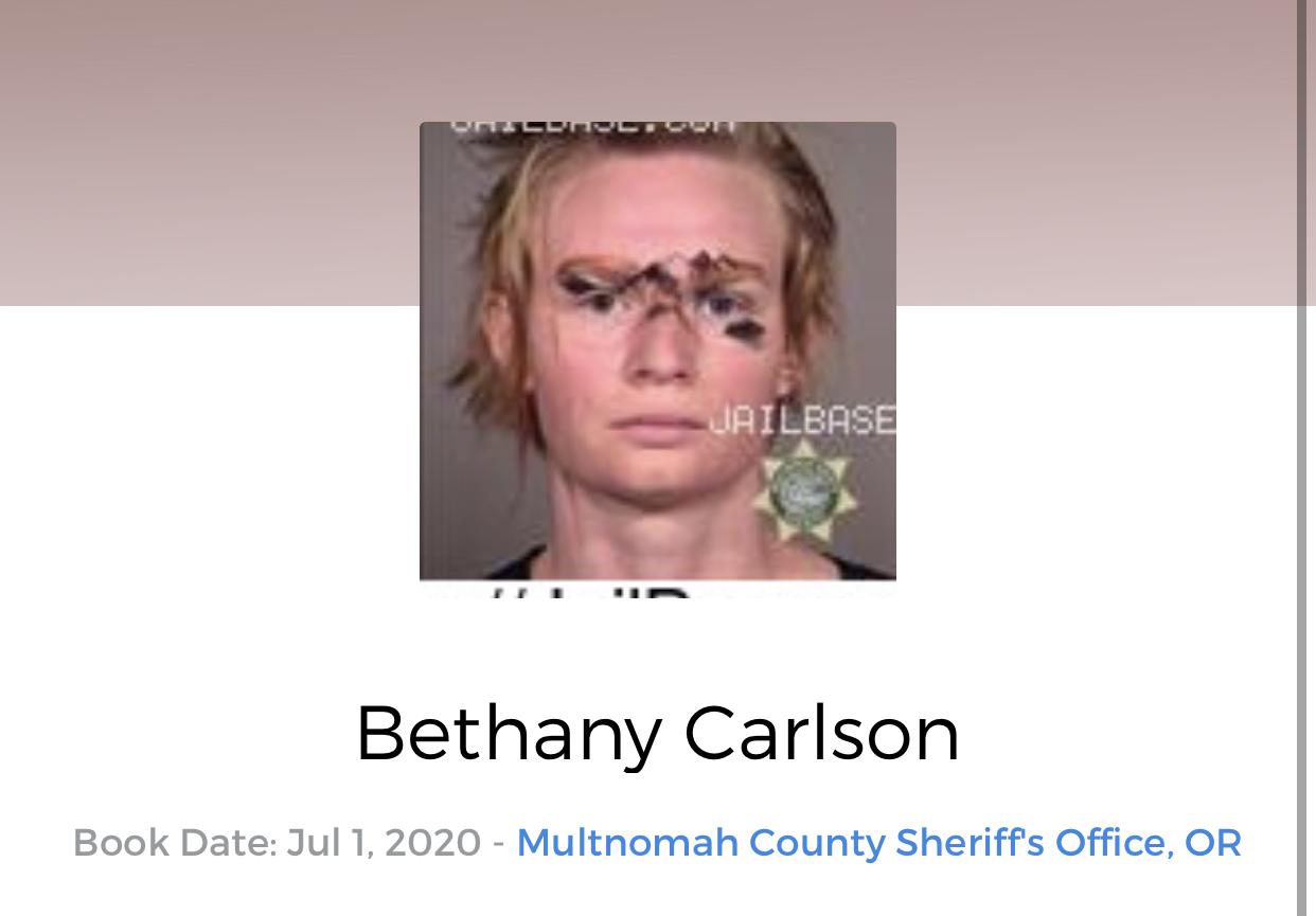 https://www.portlandoregon.gov/police/news/read.cfm?id=250940 https://twitter.com/PortlandPolice/status/1278457887073935367 http://www.mcso.us/PAID/Home/Booking/1505478 * Bethany Carlson, 27 years-old, Interfering with Police Officer, Disorderly Conduct II, Riot