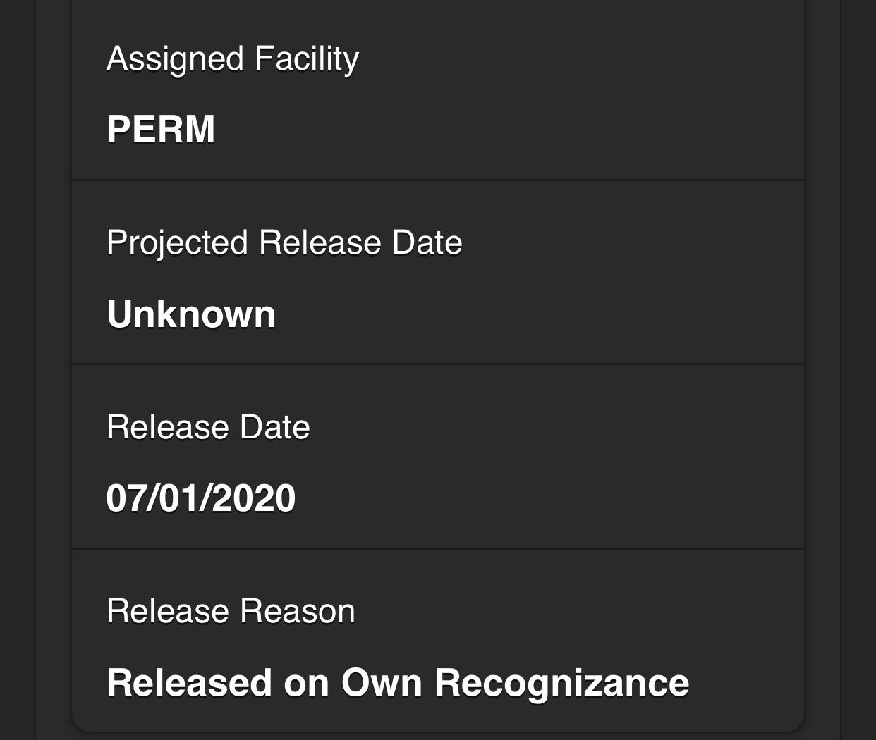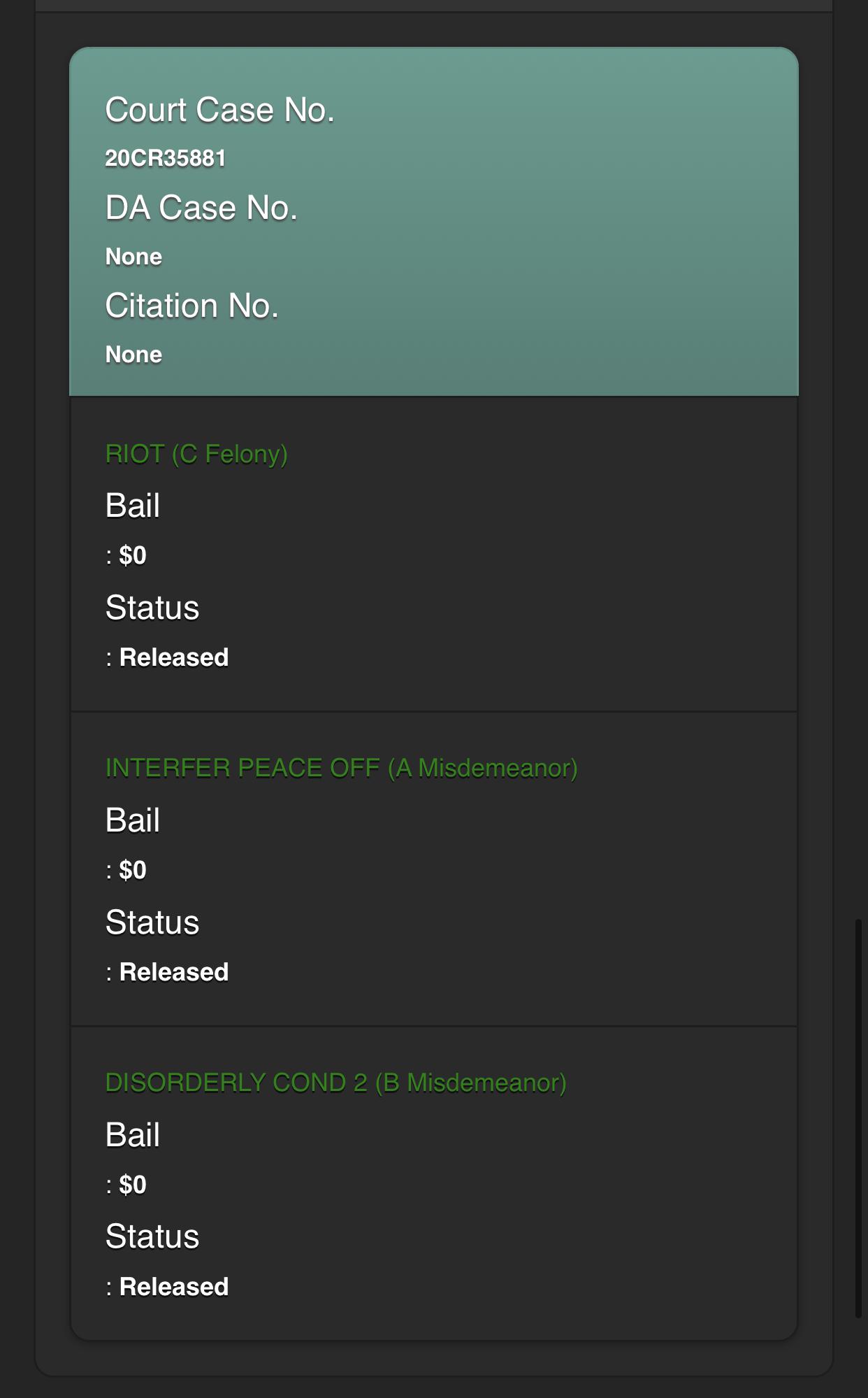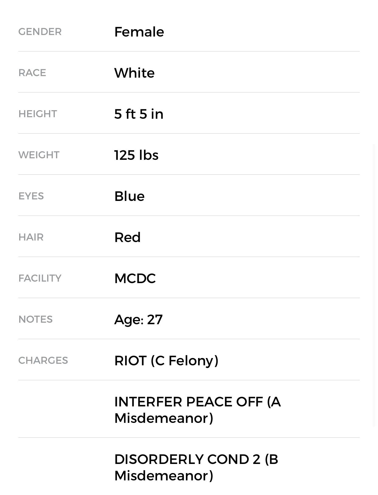 https://www.portlandoregon.gov/police/news/read.cfm?id=250940 https://twitter.com/PortlandPolice/status/1278457887073935367 http://www.mcso.us/PAID/Home/Booking/1505478 * Bethany Carlson, 27 years-old, Interfering with Police Officer, Disorderly Conduct II, Riot