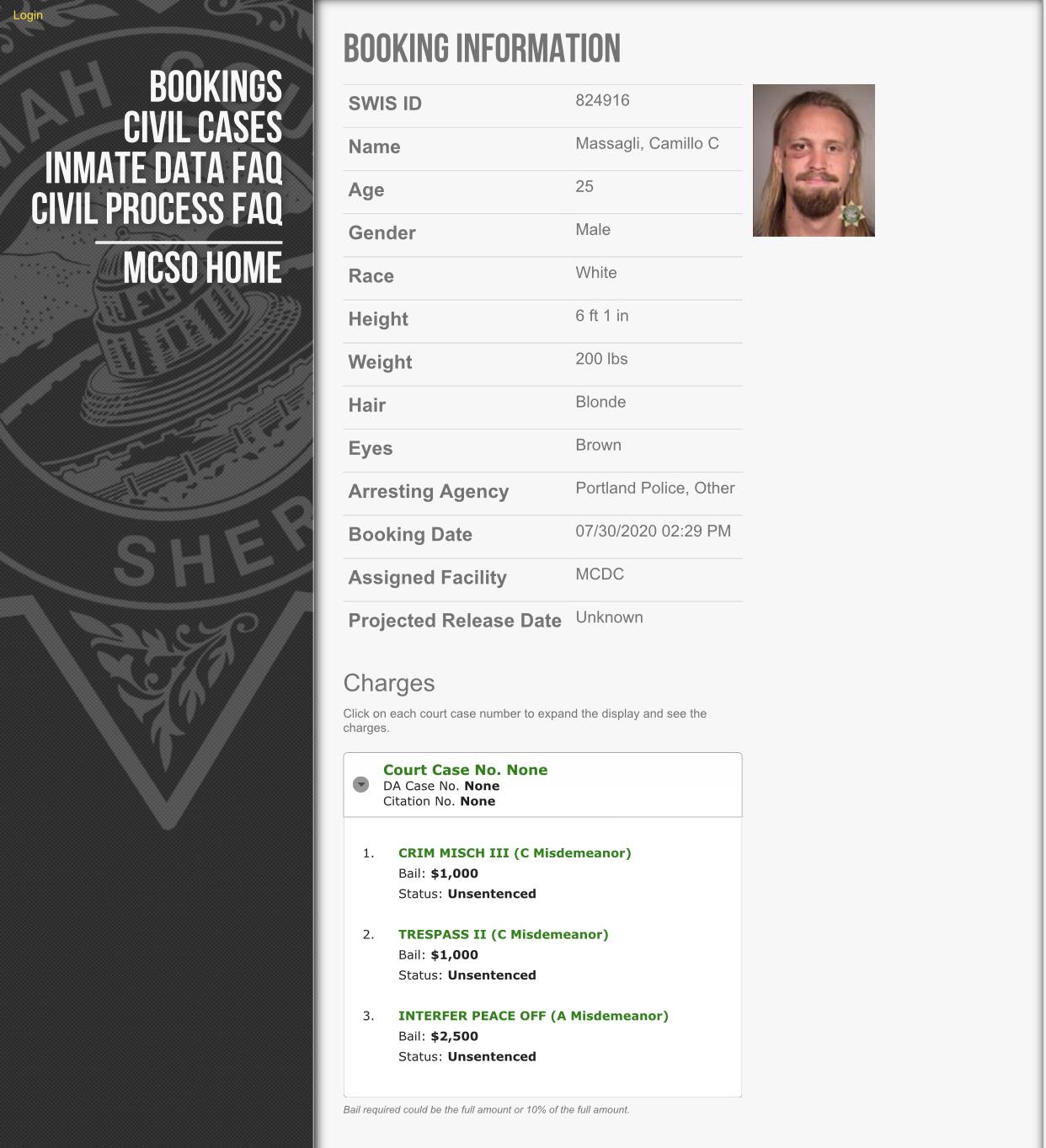 https://www.portlandoregon.gov/police/news/read.cfm?id=271260 https://archive.vn/BK6gf *Massagli, Camillo, 26-year-old, Portland, Oregon, Interfering with a Peace Officer, Disorderly Conduct II