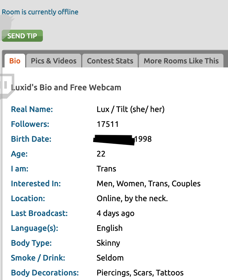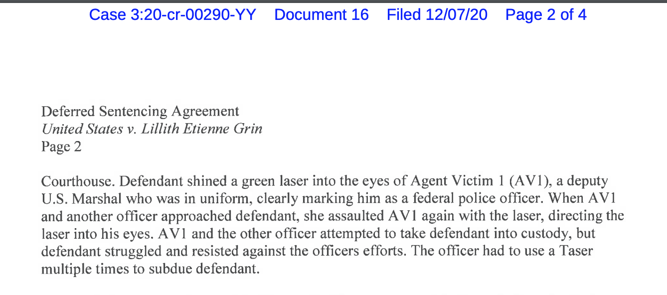 Lillith Grin, 22, is charged with assaulting a federal officer on July 12, 2020; https://www.justice.gov/usao-or/pr/74-people-facing-federal-charges-crimes-committed-during-portland-demonstrations https://www.courtlistener.com/docket/17405896/united-states-v-grin/ PDX anarchist, transexual, amateur pornstar, and twitch streamer https://chaturbate.com/luxid/ (NSFW) https://www.manyvids.com/Profile/1001559480/grindrip/Store/Videos/ (NSFW) https://linktr.ee/grindrip (NSFW)