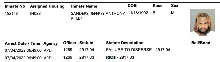 Arrested during Akron BLM riots. Arrest Date / Time Agency Officer Statute Statute Description Bail/Bond 07/04/2022 06:49:00 APD 1269 2917.04 FAILURE TO DISPERSE - 2917.04 07/04/2022 06:49:00 APD 1269 2917.03 RIOT - 2917.03