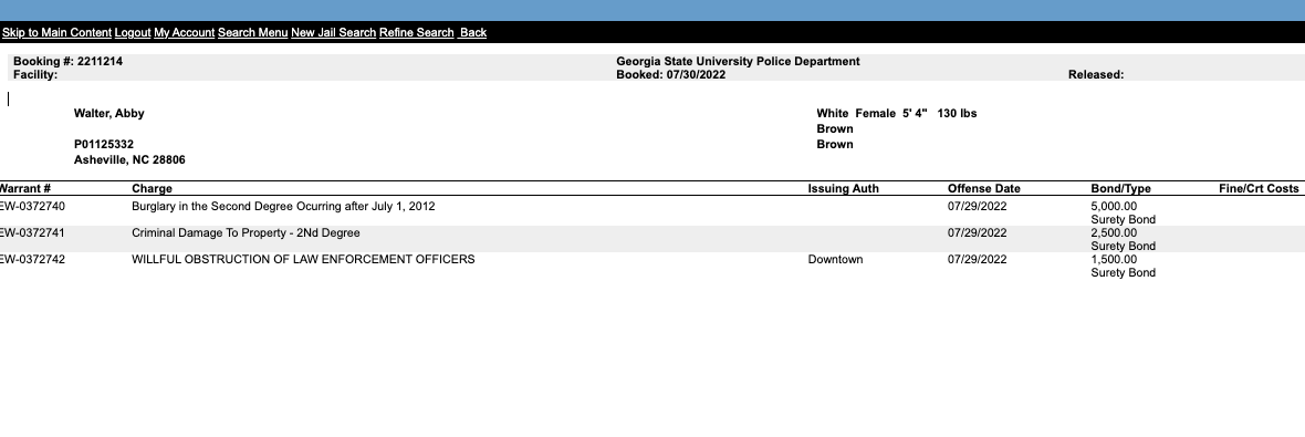 https://twitter.com/AntifaWatch2/status/1554282610511192064 https://twitter.com/UR_Ninja/status/1553581282281418753 Arrested for burglary, vandalism, and obstruction at GSU in Atlanta as a part of a 'Stop cop city' direct action targeting a worksite of the general contractor Incident Report https://wmkinstitute.com/police-incident-report-seven-arrested-for-property-destruction-at-georgia-state-university/