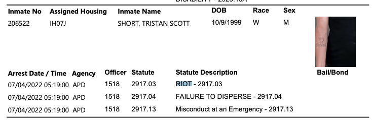 Arrested during Akron BLM riots. Arrest Date / Time Agency Officer Statute Statute Description Bail/Bond 07/04/2022 05:19:00 APD 1518 2917.03 RIOT - 2917.03 07/04/2022 05:19:00 APD 1518 2917.04 FAILURE TO DISPERSE - 2917.04 07/04/2022 05:19:00 APD 1518 2917.13 Misconduct at an Emergency - 2917.13