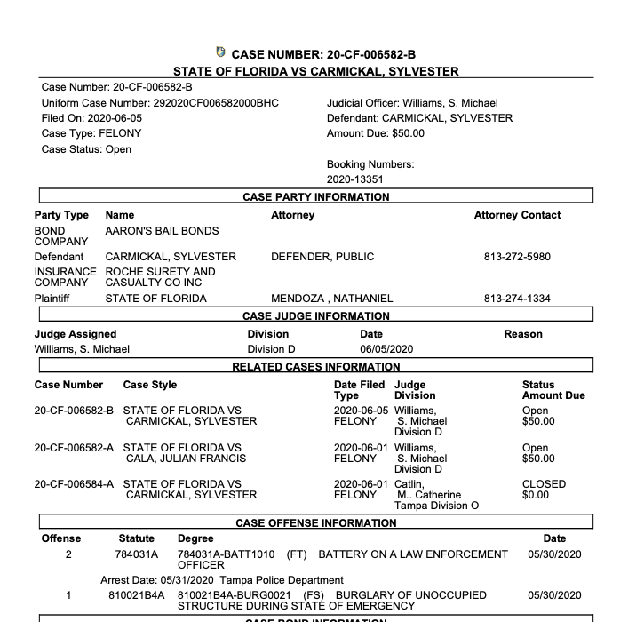 CARMICKAL, SYLVESTER 6/10/95 BATTERY ON A LAW ENFORCEMENT BURGLARY OF UNOCCUPIED STRUCTURE DURING STATE OF EMERGENCY