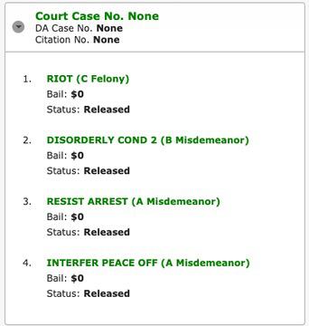 Trevor Dasaeon Colton (26) - riot, disorderly conduct, resisting and interfering. Already been released on 0$ bail https://archive.vn/4wc0u
