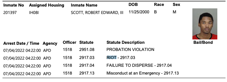 Arrested during Akron BLM riots. Arrest Date / Time Agency Officer Statute Statute Description Bail/Bond 07/04/2022 04:22:00 APD 1518 2951.08 PROBATION VIOLATION 07/04/2022 04:22:00 APD 1518 2917.03 RIOT - 2917.03 07/04/2022 04:22:00 APD 1518 2917.04 FAILURE TO DISPERSE - 2917.04 07/04/2022 04:22:00 APD 1518 2917.13 Misconduct at an Emergency - 2917.13