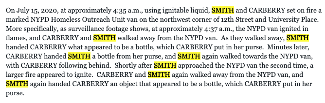https://www.justice.gov/usao-sdny/pr/brooklyn-residents-charged-arson-nypd-vehicle-manhattan https://www.nydailynews.com/new-york/ny-nypd-van-arson-case-20200813-lbtt25sjwvbj5acuefw45hpta4-story.html Announced today the arrest of COREY SMITH and ELAINE CARBERRY in connection with their destruction of a marked NYPD Homeless Outreach Unit van in Greenwich Village in Manhattan. SMITH and CARBERRY were arrested this morning and will be presented in Manhattan federal court before U.S. Magistrate Ona T. Wang later today. https://www.courtlistener.com/docket/17446441/united-states-v-smith/
