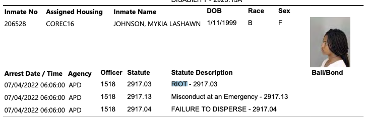 Arrested during Akron BLM riots. Arrest Date / Time Agency Officer Statute Statute Description Bail/Bond 07/04/2022 06:06:00 APD 1518 2917.03 RIOT - 2917.03 07/04/2022 06:06:00 APD 1518 2917.13 Misconduct at an Emergency - 2917.13 07/04/2022 06:06:00 APD 1518 2917.04 FAILURE TO DISPERSE - 2917.04