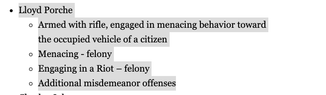 https://www.koaa.com/news/crime/arrests-made-in-connection-with-the-august-riot-that-targeted-a-cspd-sergeants-home Lloyd Porche Armed with rifle, engaged in menacing behavior toward the occupied vehicle of a citizen Menacing - felony Engaging in a Riot – felony Additional misdemeanor offenses