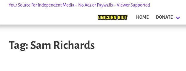 Samuel Paul Richards is a 'journalist' who has written for antifa publication Unicorn Riot. Unicorn riot is an overt antifa publication, I've included a picture from an interview with a different member of their organization where they're in bloc with Antifa flag/3arrows on their mask. Richards goes by 'MinneapoliSam' on twitter and does leftist """journalism""" going after cops and other left wing targets of interests, including this site[1] where he bemoans someone being arrested at a riot where people are throwing shit at cops for it being called 'rioting'. He's previously referred to himself on social media as a 'BLM' & an 'activist'[2] and has promoted Antifa events from groups like MNUnitedAF which uses 3 arrows stuff [3]. That MNUAF event was a full black bloc event with a shield wall and everything. Mugshot is from a DUI arrest, appears to be clean of any riot offenses, emailed booking PDF for validation. His dob is 6/6/91 1) https://archive.ph/zYcpw 2) https://web.archive.org/web/20210113051837/https://twitter.com/MinneapoliSam/status/1349224178172440582 3) https://web.archive.org/web/20201205185842/https://twitter.com/MinneapoliSam/status/1335297564485189634 He has another arrest for trespassing and obstructing the legal process. Even though he's 30-something he lives with mommy & daddy in their suburban Minneapolis home in Champlin.