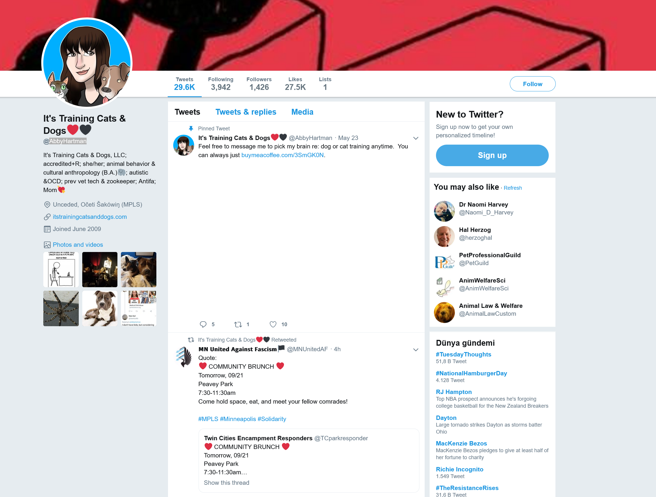 She is a vocal supporter of MN United Against Fascism, MN Uprising, and other Antifa/Anarchist Twitter accounts. She self identifies as Antifa on her now suspended account. Old Account: https://web.archive.org/web/20200921003822/https://twitter.com/AbbyHartman New Account: https://twitter.com/AbbyPetTrainer She works as a pet trainer. She verbally attacked online a woman who created a Facebook page "It's ok to be Wife", either unintentionally or intentionally believing the name was "It's ok to be White". The victim appears to be in the early stages of a lawsuit against Hartman. Note that the picture is very old, probably a high school graduation pic. https://archive.vn/ycz1a https://archive.vn/wip/MWjYv