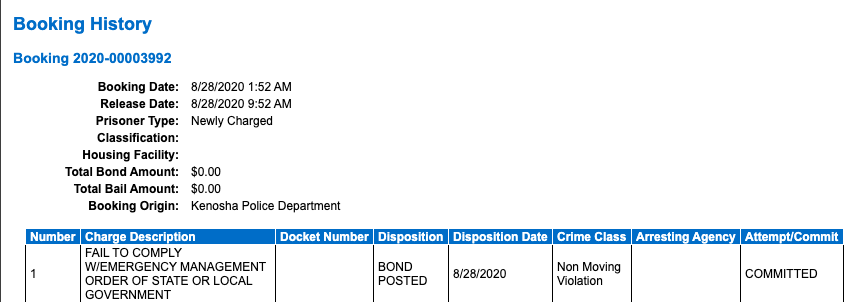 http://inmate.kenoshajs.org/NewWorld.InmateInquiry/kenosha/Inmate/Detail/-597903 FAIL TO COMPLY W/EMERGENCY MANAGEMENT ORDER OF STATE OR LOCAL GOVERNMENT DOB: 04/15/88. She's from Chicago and literally lives in a basement (her parents?)