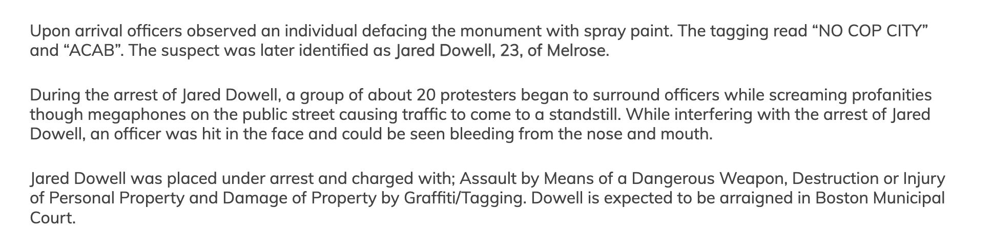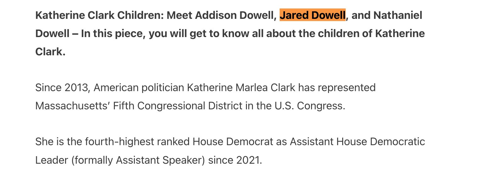 Jared 'Riley' Dowell is the son of the number 2 Democrat in the house of representatives (Katherine Clark) Jared allegedly graffiti'd "stop cop city" and assaulted police while resisting arrest at an antifa event in Boston. Jared lists attending a private liberal arts college (Middlebury) on Linkedin from 2018-2022 and appears to run a leftist mutual aid group and has posted about it on anarchist & anticapitalist subreddits. https://twitter.com/AntifaWatch2/status/1617220630297939972 https://bpdnews.com/news/2023/1/22/tmn87xossij9grhs7vwb79ankv7c3u