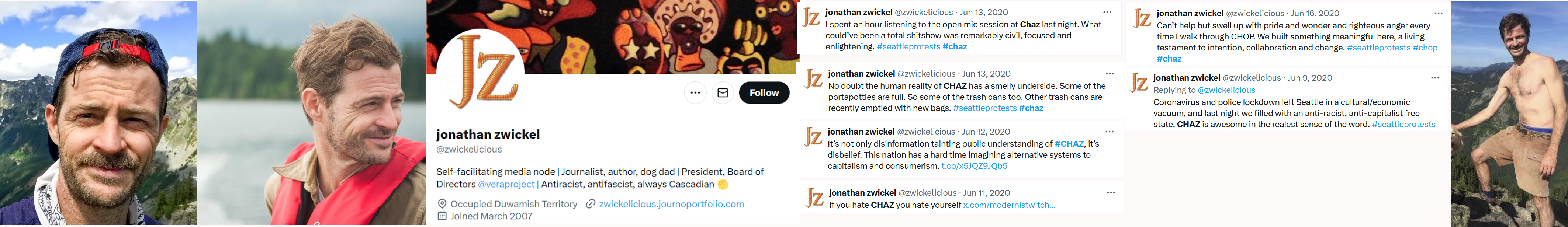 He's a self-professed Antifa from Seattle who participated in the CHAZ uprising in June 2020. He also spent a lot of time Tweeting about how great CHAZ was. Zwickel is President of the Vera Project, an organization that promotes radical expression by Seattle artists. Zwickel is an author who's been published in Rolling Stone, the New York Times and other national publications. He's also a climber who summited Mt. Rainier. https://zwickelicious.journoportfolio.com/