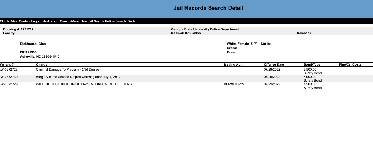 https://twitter.com/AntifaWatch2/status/1554282610511192064 https://twitter.com/UR_Ninja/status/1553581282281418753 Arrested for burglary, vandalism, and obstruction at GSU in Atlanta as a part of a 'Stop cop city' direct action targeting a worksite of the general contractor May be this person, jails do sometimes misspell names https://wlos.com/news/local/10-arrested-for-felony-littering-asheville-parks-activists-investigation-pageant-nevel-amy-hamilton-thibert-julia-weber-alexander-bergdahl-kathryn-hudson-nicole-villagran-gina-dickhaus-sarah-norris-erica-deaton-elsa-enstrom Her name is Gina Marie Dickhaus (cops can't spell), DOB: 02/04/92. She may be related in some way to Margaret "Maggie" Dickhaus (https://antifawatch.net/ViewReport/3fc3c578), a member of Wayne Dixon's (https://antifawatch.net/ViewReport/885ba284) Redneck Revolt chapter but the two Dickhaus aren't linked on people finder sites. Gina has a ton of minor offenses, most of which seem to have been dismissed. She thoughtfully donated to a GoFundMe for a transvestite's surgery in 2021. She works as a bar manager and lives in a neatly kept house with a bunch of roommates in Asheville. https://archive.ph/CTR82 https://www.linkedin.com/in/gina-dickhaus-62b81bb0 https://www.instagram.com/cunnus_diaboli/ (Unverified) Incident Report https://wmkinstitute.com/police-incident-report-seven-arrested-for-property-destruction-at-georgia-state-university/