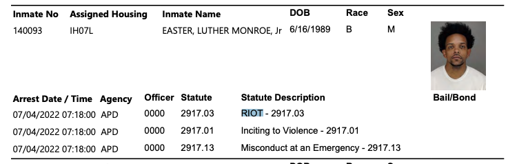 Arrested during Akron BLM riots. Arrest Date / Time Agency Officer Statute Statute Description Bail/Bond 07/04/2022 07:18:00 APD 0000 2917.03 RIOT - 2917.03 07/04/2022 07:18:00 APD 0000 2917.01 Inciting to Violence - 2917.01 07/04/2022 07:18:00 APD 0000 2917.13 Misconduct at an Emergency - 2917.13