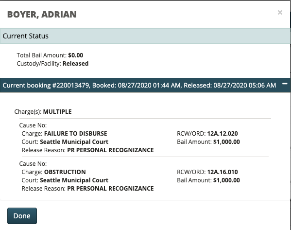 Arrested and charged with obstruction and failure to disperse for 8/26 Seattle Riots.