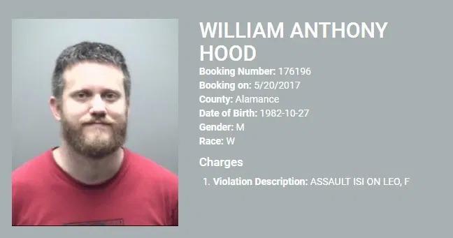 William Anthony Hood, 34, was charged with assault on a law enforcement officer inflicting serious injury and misdemeanor possession of a weapon at a parade or rally. Bond was set at $15,000. https://www.thetimesnews.com/news/20170522/us-marines-duke-lecturer-arrested-at-confederate-rally https://archive.vn/SQpMk