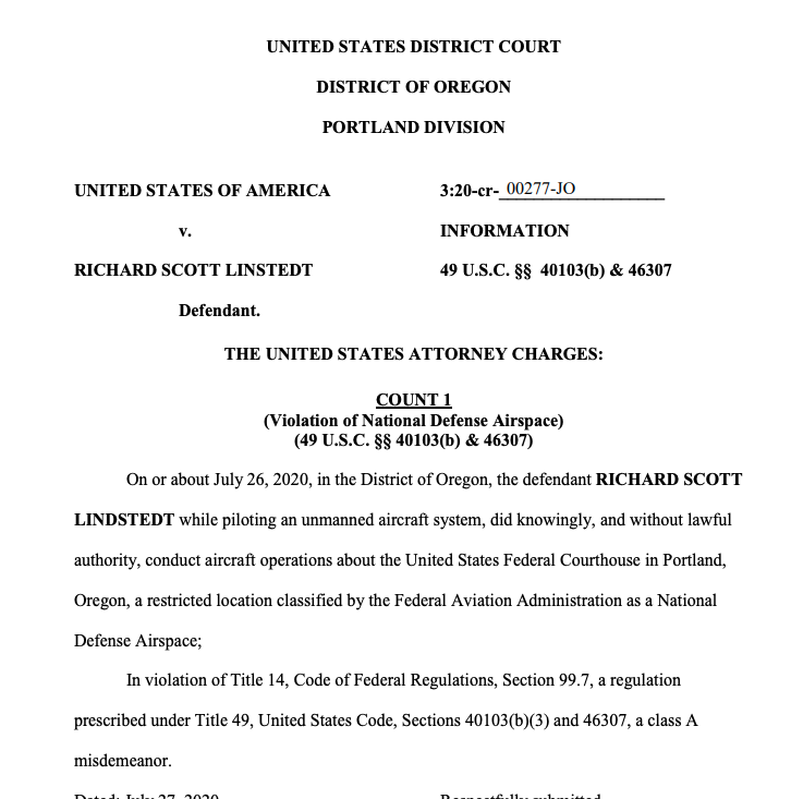 http://www.mcso.us/PAID/Home/Booking/1506291 Arrested by Federal Marshalls at July 25th riot Richard Lindstedt, 33, is charged with violating national defense airspace on July 25, 2020; https://www.courtlistener.com/docket/17383963/united-states-v-linstedt/