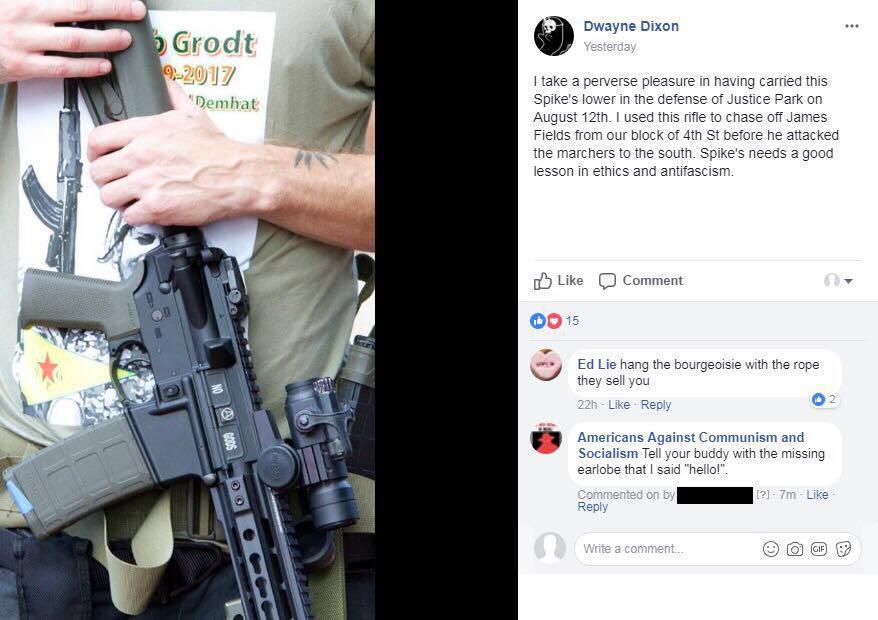 https://farleftwatch.com/this-unc-professor-is-part-of-a-far-left-militia-group/ https://bigleaguepolitics.com/watch-leftist-professor-dwayne-dixon-brags-class-waved-rifle-charlottesville-driver-crash/ https://bigleaguepolitics.com/antifa-professor-dwayne-dixon-will-stand-trial-for-assaulting-big-league-politics-editor/ https://www.youtube.com/watch?v=C9Kj8D81yqE https://www.dailytarheel.com/article/2018/11/dwayne-dixon-1116 https://www.youtube.com/watch?v=kcFfz7TtPog&feature=emb_title https://www.thetruthaboutguns.com/did-gun-wielding-redneck-revolt-antifa-demonstrator-cause-charlottesville-car-crash/ https://www.idahostatesman.com/news/article169809062.html Dwayne Emil Dixon Leader within redneck revolt, an armed antifa allied org, told his students that he confronted James Fields, with a loaded semi-automatic rifle. Assaulted a BigLeaguePolitics Editor https://www.foxnews.com/us/unc-professor-placed-leave-after-far-left-redneck-revolt-gun-club-membership-exposed