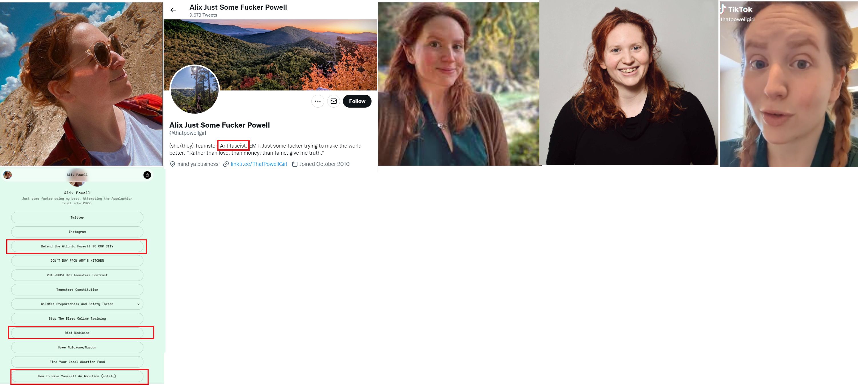 She describes herself as "antifascist" on her Twitter profile. She's a member of the Teamsters union and likes to hike and fence. She attempted to solo the Appalachian trail in 2022. The many-talented Ms. Powell is also a photographer and once hoped to pursue a career in art. She helpfully provides links on her LinkTree page to information on how to give oneself an abortion (I assume the procedure involves a coat hanger) as well as links to riot medicine and the Atlanta Cop City protests. She's believed to live in the Portland suburb of Vancouver. https://web.archive.org/web/20221113173946/https://www.orionfencing.org/staff https://www.flickr.com/photos/alixisincollege/ https://linktr.ee/ThatPowellGirl https://www.alixpowell.com/
