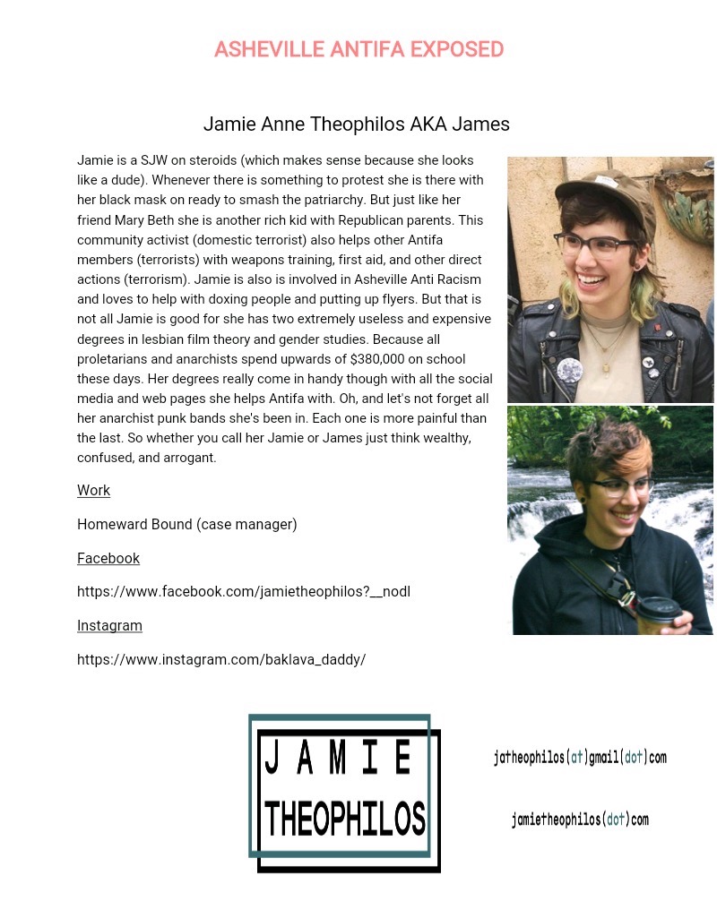 https://northcarolina.arrests.org/Arrests/Jamie_Theophilos_28681208/ archive http://web.archive.org/web/20201211030417/https://northcarolina.arrests.org/Arrests/Jamie_Theophilos_28681208/ Jamie Anne Theophilos was arrested in 2016 in Asheville for protesting. She is core Torch Antifa leadership, former Firestorm employee, and Final Straw Anarchist host. Some updated info for her. school info / https://mediaschool.indiana.edu/people/profile.html?p=jatheoph new e-mail / [email protected] web site / https://jtmedia.works/ vimeo site with more links of hers / https://vimeo.com/jatheophilos new Instagram as well http://instagram.com/bed_thyme/ Jamie Theophilos is also one of the radio hosts for The Final Straw which is a weekly anarchist program funded by Firestorm books. It is recorded at the studio of 103.3 Asheville FM in West Asheville. Jamie uses the alias William Goodenough for her DJ name on the program. https://thefinalstrawradio.noblogs.org