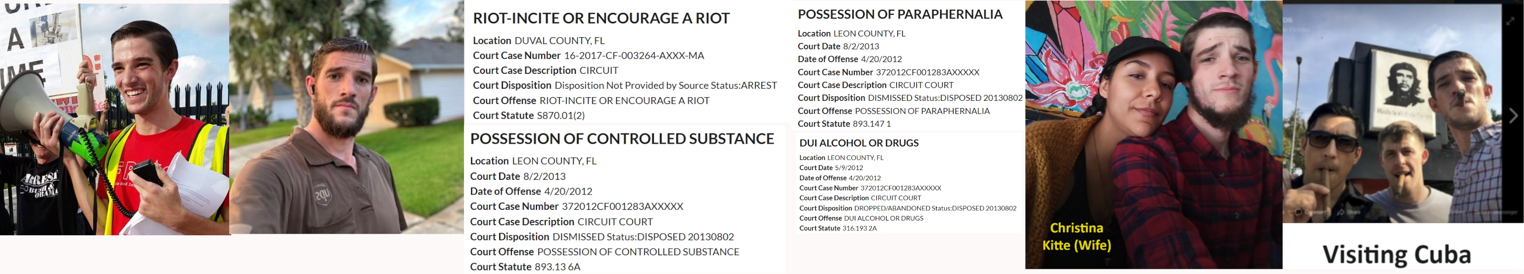 David Marlow Schneider (Born Apr. '90) is a member of the communist Freedom Road Socialist Organization who was arrested at a 2017 anti-war protest in Jacksonville and charged with inciting a riot. He had prior charges for DUI, possession of a controlled substance and possession of drug paraphernalia. He took a trip to communist Cuba in 2016. Schneider attended the University of Florida and was a member of the radical Students for a Democratic Society. He's married to fellow FRSO member Christina Kittle. Schneider works as a Teamsters union steward. https://archive.ph/fv2pB