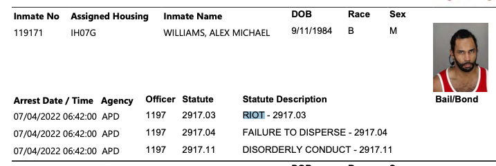 Arrested during Akron BLM riots. Arrest Date / Time Agency Officer Statute Statute Description Bail/Bond 07/04/2022 06:42:00 APD 1197 2917.03 RIOT - 2917.03 07/04/2022 06:42:00 APD 1197 2917.04 FAILURE TO DISPERSE - 2917.04 07/04/2022 06:42:00 APD 1197 2917.11 DISORDERLY CONDUCT - 2917.11
