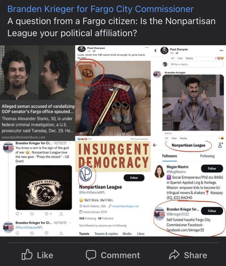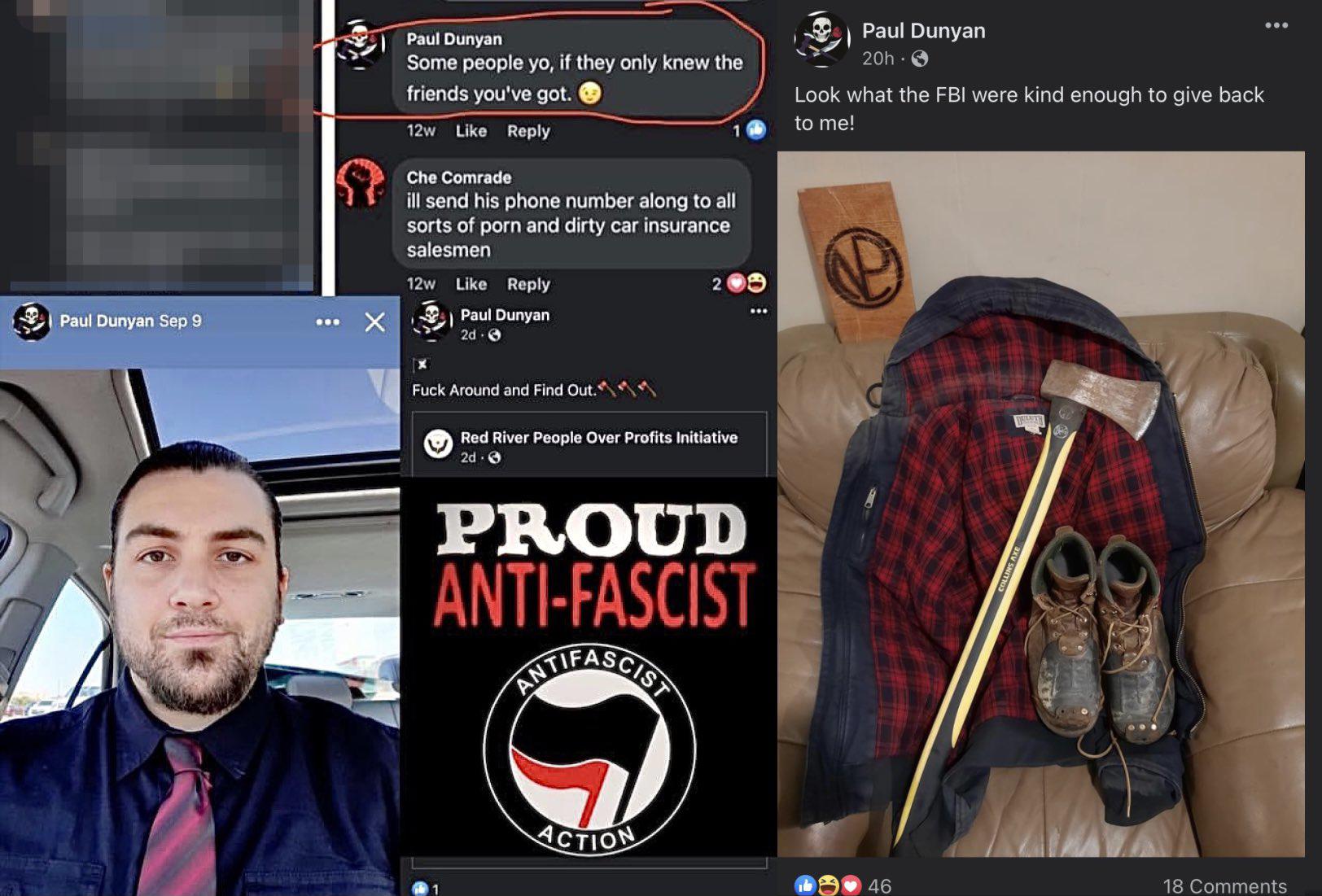https://www.duluthnewstribune.com/news/crime-and-courts/6820966-Alleged-axman-accused-of-vandalizing-GOP-senators-Fargo-office-spouted-left-wing-views-charges-say Thomas Alexander Starks (30) federally charged for attacking U.S. senator’s office in Fargo with an Axe on Dec 21. He was “politically open and motivated,” left-leaning and “very active in protests,” according to police. https://pjmedia.com/kevindowneyjr/2021/11/23/ax-wielding-antifa-member-attacks-gop-senators-office-dems-give-him-money-fbi-returns-ax-n1535869