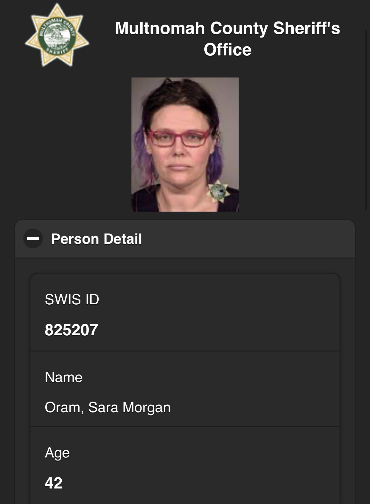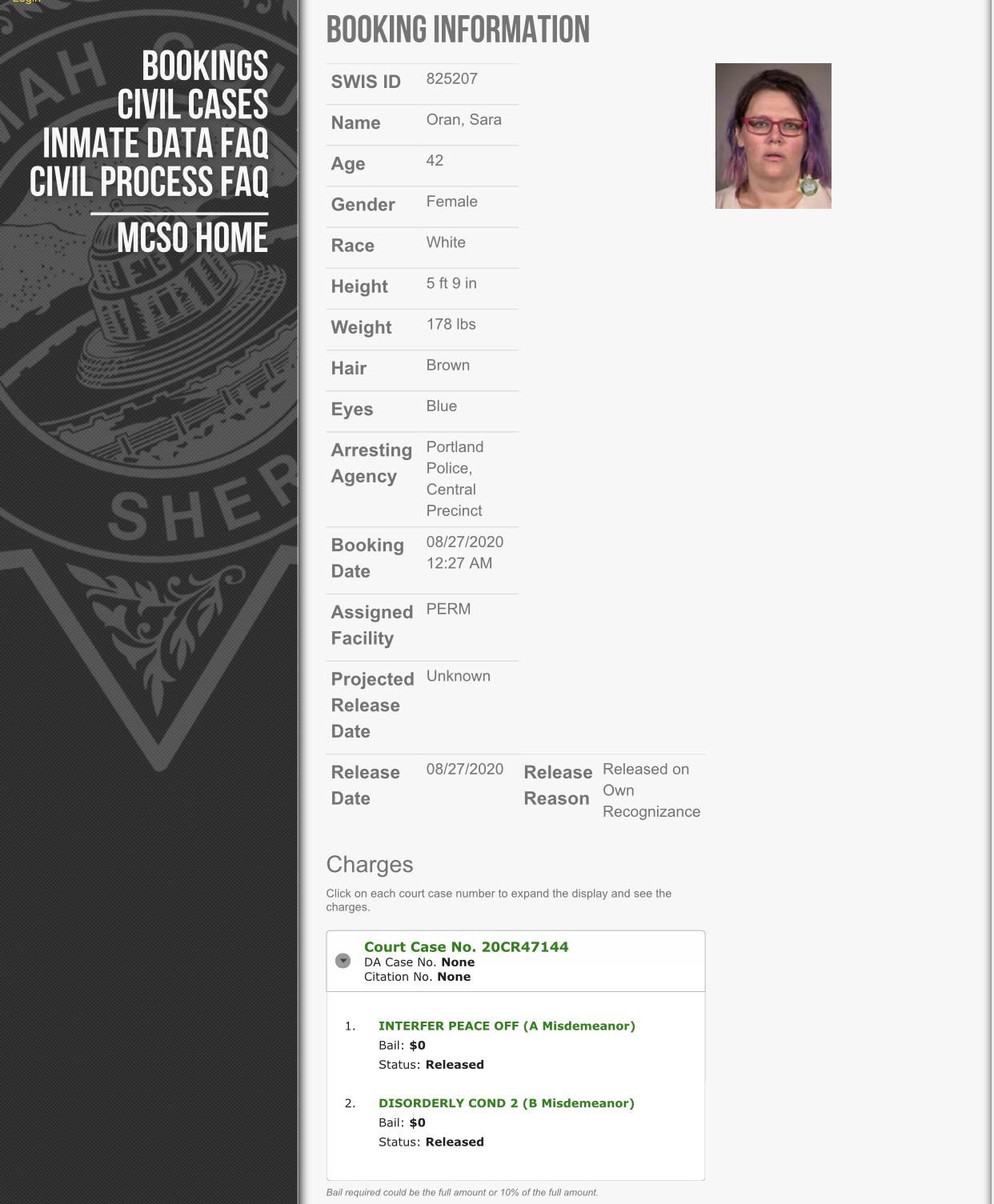 https://www.portlandoregon.gov/police/news/read.cfm?id=261144 *Oram, Sara, 42, of Portland, Oregon, Interfering with a Peace Officer, Disorderly Conduct II