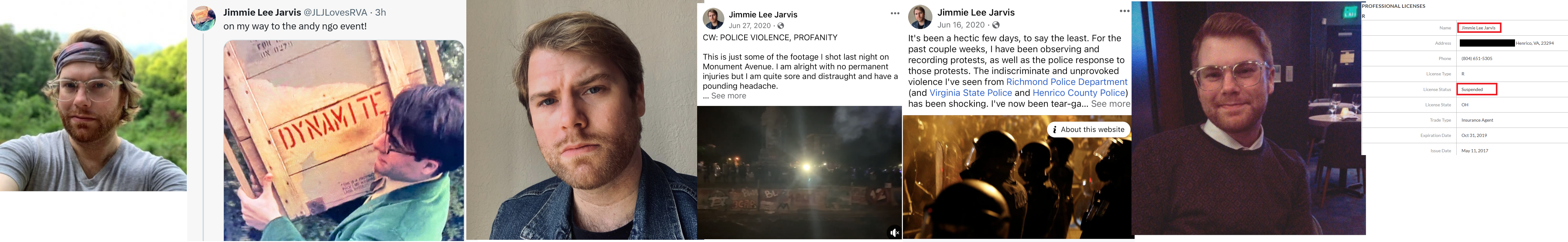 Jimmie Lee Jarvis is an alleged Antifa who threatened to blow up an Andy Ngo speaking engagement in posts on Twitter in September 2023. His Facebook account has images and videos showing he participated in at least two violent protests or riots in June and August 2020 some of which he referred to as "police riots". He was sued by a Virginia state senator for defamation and shilled on GoFundMe to fund his defense. Unsurprisingly, Jarvis is a member of Richmond's far-left Richmond Democrats. Jarvis is a private investigator and runs a PI firm called Mission Control Research & Consulting. He appears to have previously worked as an insurance agent but his license was suspended. He lives in the Richmond area. https://archive.ph/QtScm,https://archive.ph/ssTtj, https://archive.ph/e5BYp https://www.linkedin.com/in/jljlovesrva He was arrested about a week after he made the bomb threat. https://archive.ph/CB2tM